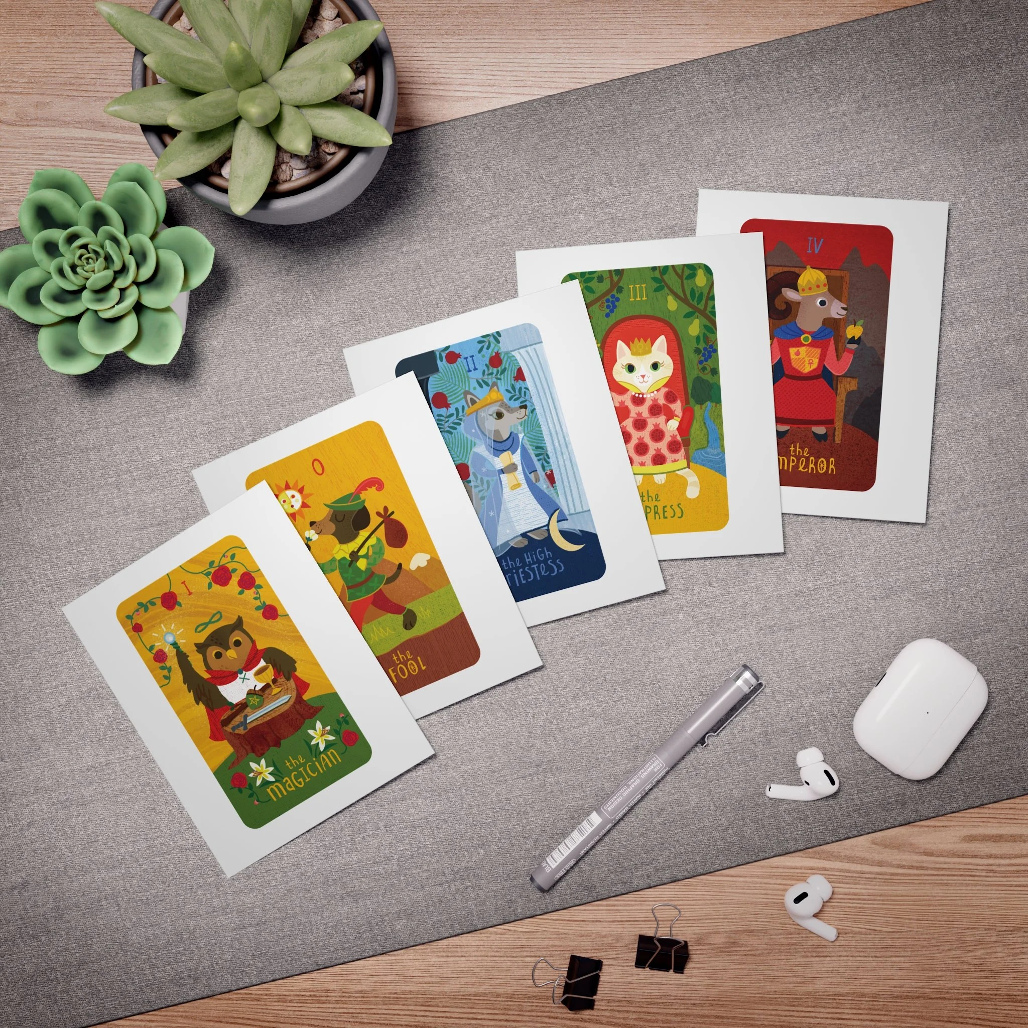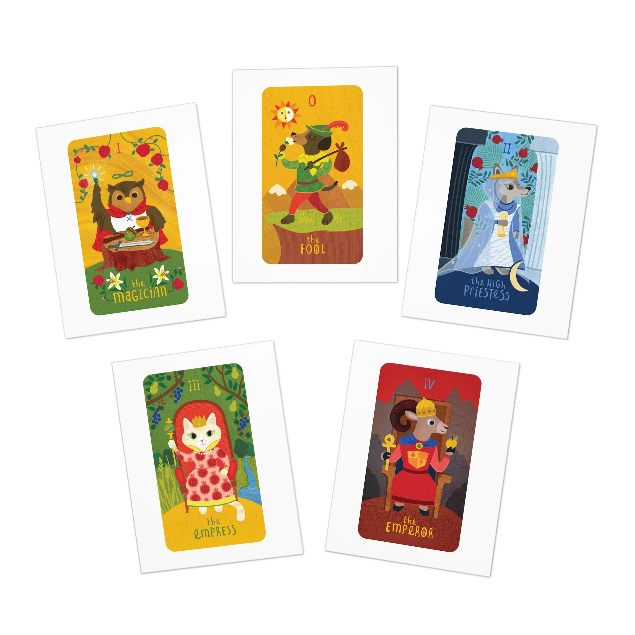 Cosmic Critters Greeting Cards — 5-Pack Blank Note Cards (Magician, Fool, Priestess, Empress, Emperor)