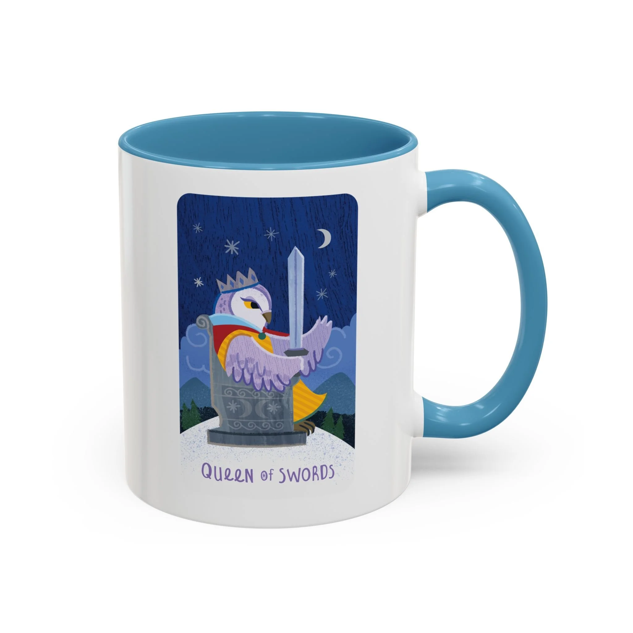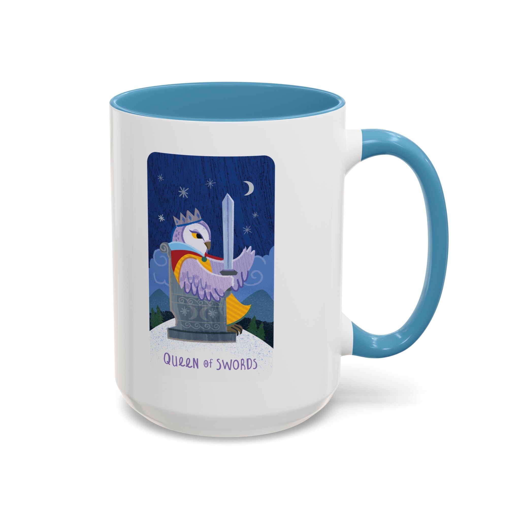 This ceramic accent mug, featuring the Queen of Swords, brings a playful, storybook energy to your morning ritual. Bright, high-resolution art wraps around a glossy white body with a contrasting colored interior and handle. The sturdy C-handle fits comfortably in hand while the dishwasher- and microwave-safe finish makes it easy to use every day. Choose 11oz or 15oz and pick an interior/handle color that pops against the vibrant print to match your kitchen or workspace.