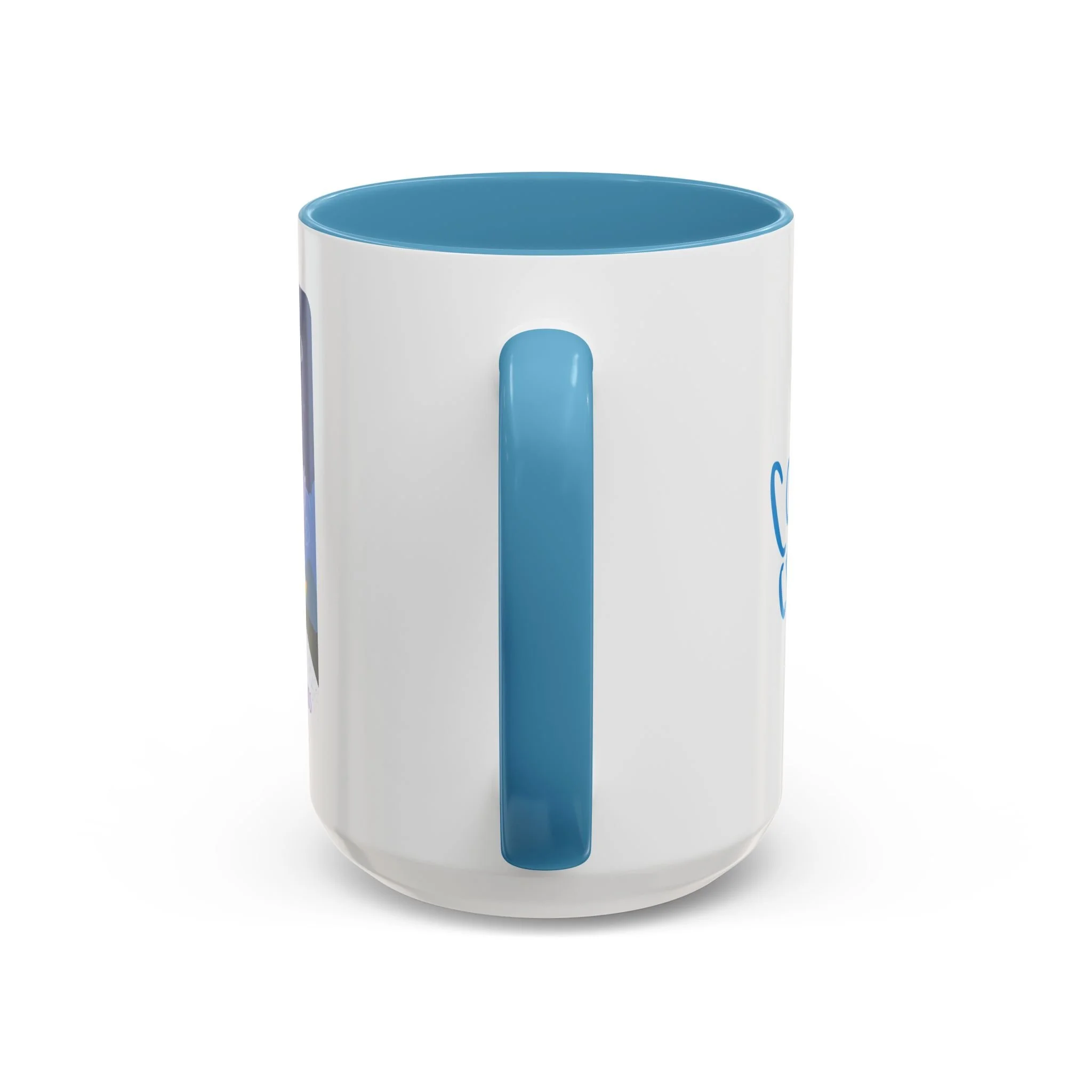 - White ceramic body with colored interior and C-handle