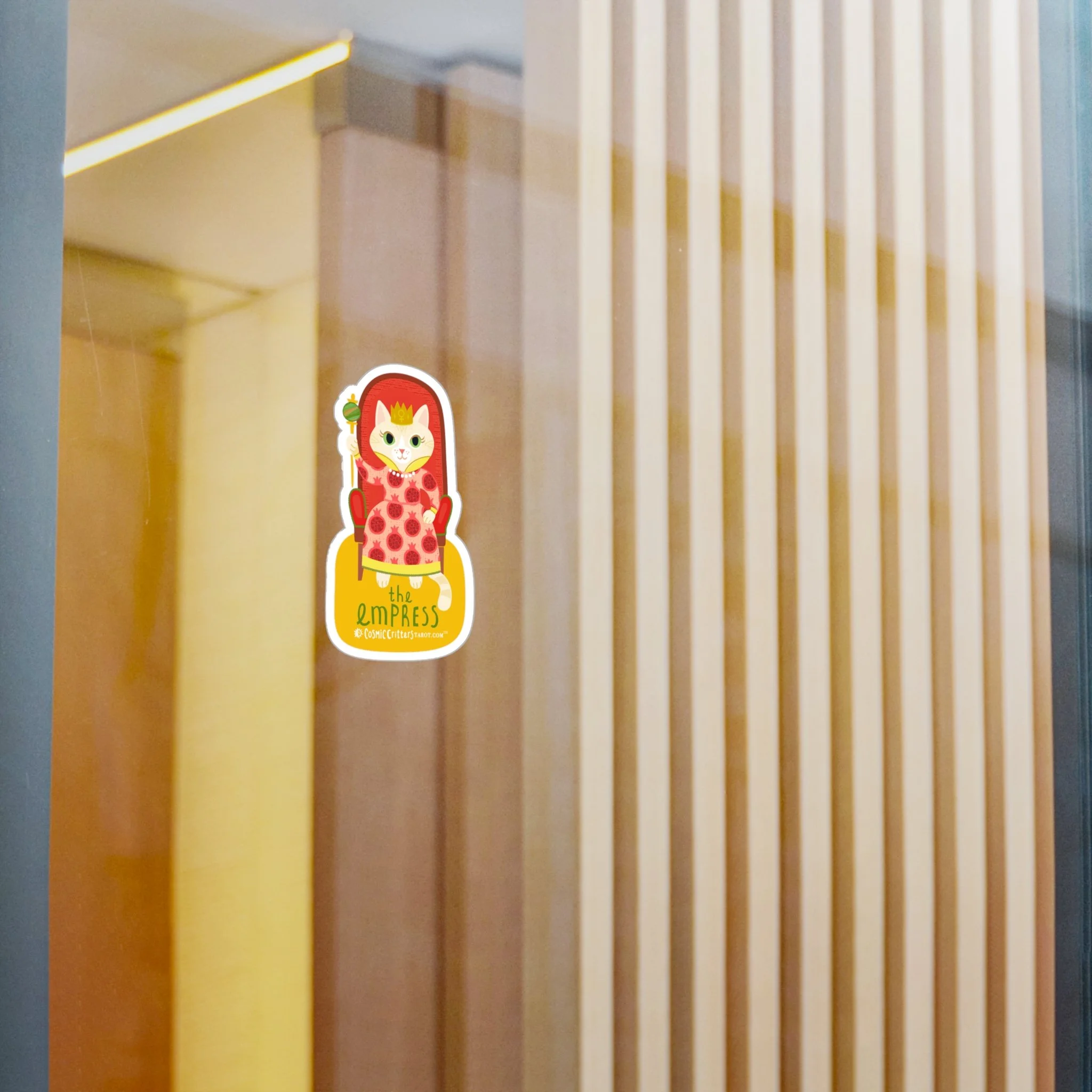 A playful kiss-cut vinyl decal, featuring the Cosmic Critters Tarot Empress Cat, brings a bright, whimsical energy to laptops, water bottles, windows, and planners. The satin finish gives the colors a soft sheen while protecting the print; vibrant inks keep the illustration lively outdoors. Easy to remove without residue, this small sticker slips into everyday life: mark your travel journal, brighten a commuter mug, or add a tiny talisman to a phone case. The durable vinyl holds up to water, sun, and scuffs so the artwork keeps its charm through seasons of use.